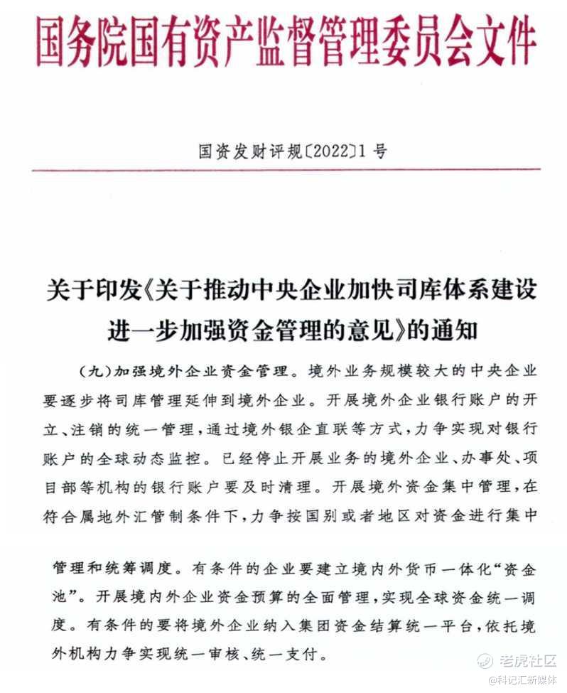国务院国资委于2022年1月印发了《关于推动中央企业加快司库体系建设进一步加强资金管理的意见》,其中强调要求“加强境外企业资金管理”,并提出了8点具体的建设要求,包括:境外银行账户统一管理、境外银企直连、全球账户动态监控、境外停用账户清理、境外资金集中、境内外一体化资金池、全面预算和统一结算平台,通过境外资金管理的加强,“将司库管理延伸到境外企业”。