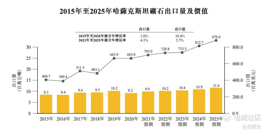 哈萨克斯坦粗铁矿石生产产生的收益由2015年约1,365亿坚戈增长至2020年约4,768亿坚戈,复合年增长率约为28.4%。同期粗铁矿石产量由约37.3百万公吨增长至约62.9百万公吨,复合年增长率约为11.0%。预计将由2021年约4,983亿坚戈增至2025年约6,187亿坚戈,复合年增长率约为5.6%。预测同期哈萨克斯坦粗铁矿石的预计产量将由约68.8百万公吨增至约77.9百万公吨,复合年增长率约为3.2%。