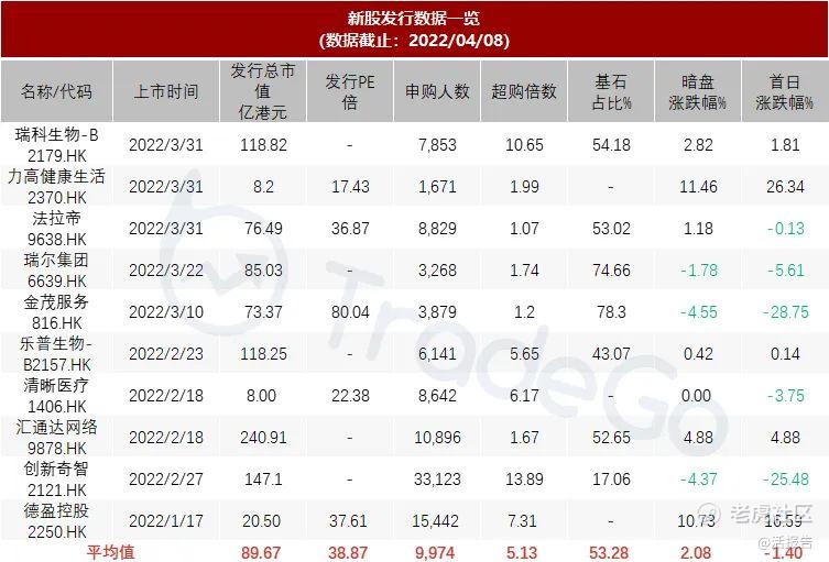 据捷利交易宝数据统计,近10家上市新股发行总市值均值为89.67亿,其中最大市值为汇通达网络,最小市值为清晰医疗;发行PE均值为38.87倍,PE整体水平偏上;申购人数均值为9974人;超购倍数上,均值为5.13倍左右;基石占比上,目前基石比例均值维持在53.28%,整体来说,基石比例有增长趋势;暗盘及首日收益率上,今年1月以来好坏参半;2月份,新上市的汇通达表现尚可,清晰医疗则一般,乐普生物-B则微涨;3月份初金茂服务首日大跌28.75%,物管类公司依然不受市场看好;瑞尔集团上市首日表现略差,但在3月份即将结束之时,新上三家新股暗盘表现颇为亮眼,其中最大黑马为力高健康生活。