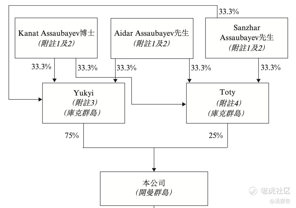 招股前,Yukyi及Toty将分别实益拥有已发行股份的约75%及25%。Peter Brigham先生分别作为代名人为及代表Kanat Assaubayev博士、Aidar Assaubayev先生及Sanzhar Assaubayev先生持有Yukyi及Toty各自的约33.3%、33.3%及33.3%的股权。由于(i)Yukyi有权于公司股东大会上行使30%或以上的表决权;(ii)Peter Brigham先生作为代名人有权通过Yukyi及Toty于公司股东大会上控制行使30%或以上的投票权;及(iii)Peter Brigham先生分别作为代名人为及代表Kanat Assaubayev博士、Aidar Assaubayev先生及Sanzhar Assaubayev先生持有Yukyi及Toty各自的约33.3%、33.3%及33.3%的股权。