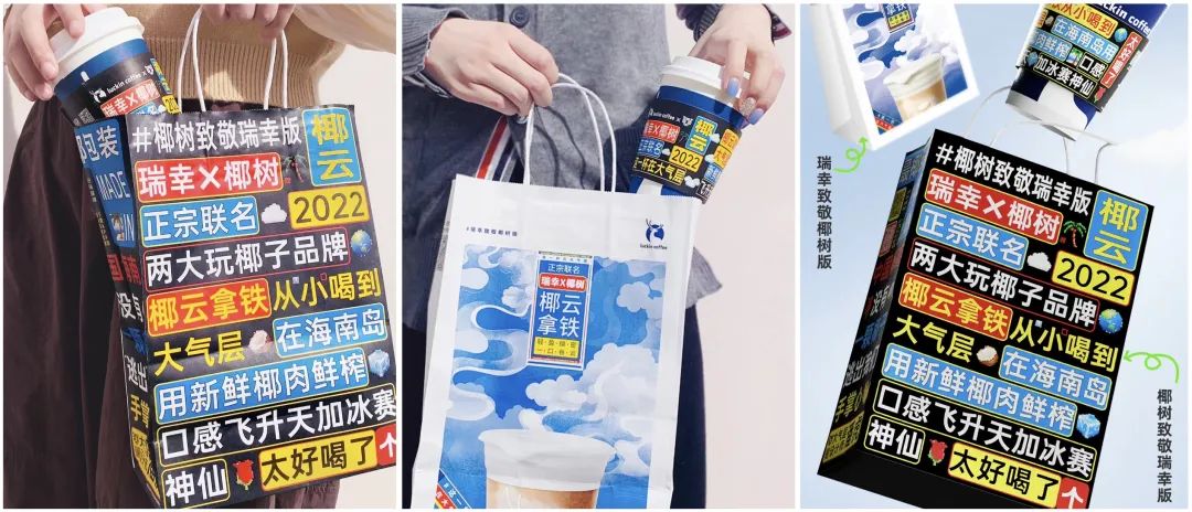 但最终出圈的是杯套和包装纸袋上醒目的“椰树风”土味文字,再加以椰树牌椰汁和瑞幸生椰拿铁的口味背书,“椰云拿铁”迅速成为了年轻人的打卡拍照对象,在朋友圈、小红书等平台的掀起一阵“椰云拿铁”热,一时间一杯难求。