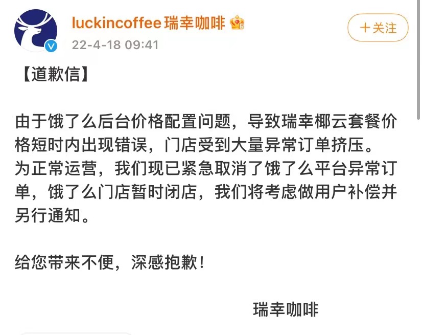 针对瑞幸椰云套餐价格出错的原因,瑞幸咖啡最开始在官方微博发布道歉信称,“超低价格因饿了么后台价格配置问题,由于门店受到大量异常订单挤压,为正常运营瑞星咖啡已紧急取消了饿了么平台的异常订单,饿了么门店暂时闭店,公司将考虑后期做用户补偿。”
