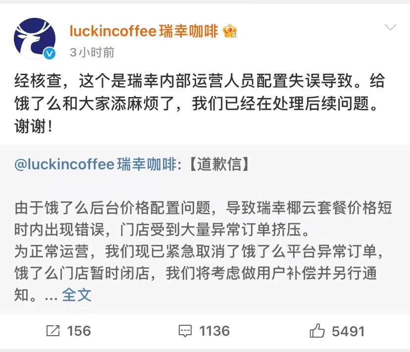 随后,瑞幸咖啡再次发布微博,称:经核查是瑞幸内部运营人员配置失误导致。给饿了么和大家添麻烦了,并表示已在处理后续问题。