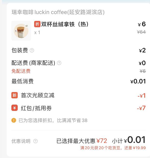 4月18日上午,多名瑞幸咖啡消费者在社交媒体表示,饿了么瑞幸咖啡出现价格漏洞,多款套餐产品出现超低价格:原价64元的椰云拿铁套餐,仅售6.5元。在使用饿了么红包的情况下,仅用3.5元便可购买;甚至有消费者仅用1分钱便买到了原价64元的“双杯生椰拿铁“套餐,短时间内迅速吸引大量消费者赶来“薅羊毛”。