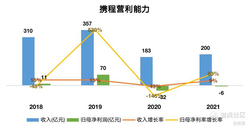 可见,疫情对旅游股的影响是巨大的。以携程为例,财报数据显示,携程2021年全年的营收为200.29亿元,同比增长9%。其中除旅行团收入同比下降以外,住宿预订收入、交通票务收入、商务旅行收入等同比均有所增长。但是,2021携程全年营收仍只相当于疫情前2019年营收的56.1%,并且仍处于亏损状态。携程复苏的程度仍然有限。