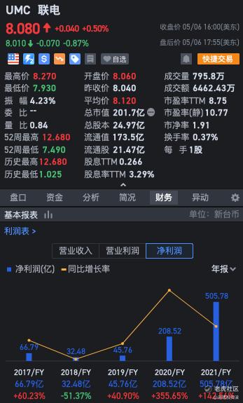 联电(UMC)5年来营收除2019年外保持增长,近两年增速很快;营业利润和净利润也在2020年和2021年有了很大突破,超越了500亿规模。