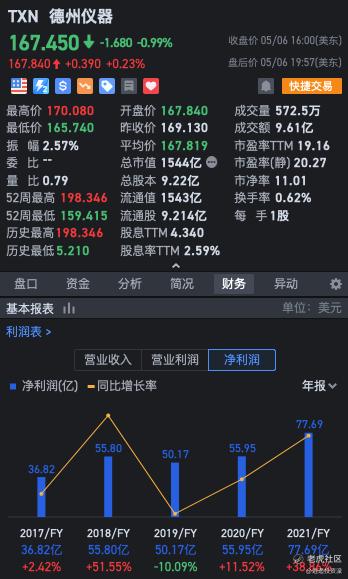 德州仪器(TXN)营收5年来除2019年萎缩8.9%外慢速增长了4年,2021年猛增27%;营业利润2019年下降了15%,2021年暴增50%;净利润2019年下降10%,2021年增长39%,2021年之前3年平均增长率15%。