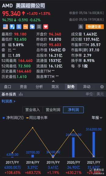 美国超微公司(AMD)2021年营收暴增了68.3%,营业利润增加166.5%;由于2020年有12亿的税务补贴影响,净利润2020年显得很高,2021年实打实的增长,反倒增速显得慢了。刨除税务补贴影响,2021年净利润增速应该在2倍以上。