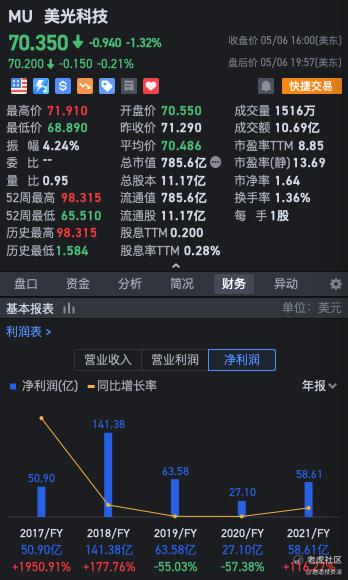 美光科技(MU)5年营收、营业利润和净利润曲线吻合的很好,都是2019到2020年萎缩,2021年部分恢复。