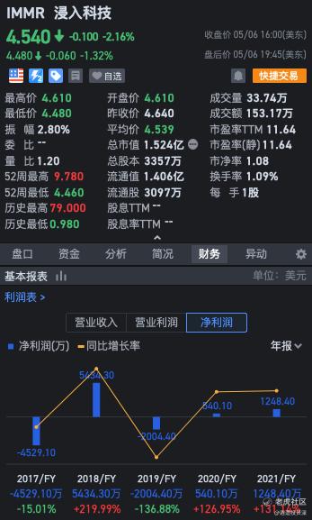 浸入科技(IMMR)是个市值仅有1.5亿的超小盘股。营收在2018年达到1.11亿峰值后迅速回落,目前仅有3500万,营业利润和净利润近两年改善明显。