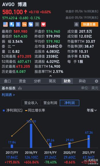 博通(AVGO)营收保持5年增长,但是营业利润在2019年下滑22%,到2021年才大幅恢复;净利润则是在2018年达到高峰,2019年下滑78.4%后,2020和2021连续增长两年。