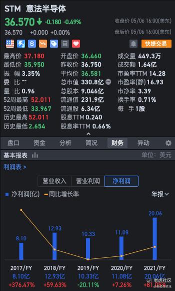 意法半导体(STM)5年营收、营业利润和净利润曲线吻合的很好,都是除2019年萎缩外保持高速增长。