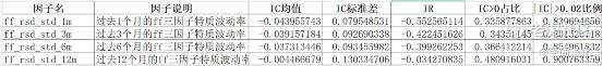 结果表明随着波动率计算周期的增加,因子效果逐渐减弱,前三个因子的IC分析结果较理想,ff_rsd_std_1m表现最佳。
