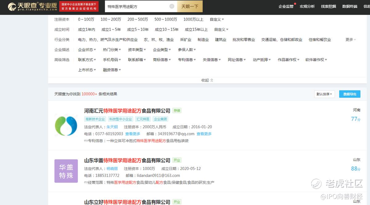再加上新政的出台在某种程度上又会进一步加快国产特医食品的规模化上市的速度,而特医食品新玩家的大量涌入可能会在一定程度上对纽迪希亚们现在的市场地位造成二次冲击。事实上,在天眼查APP上搜索“特殊医学用途配方”关键词,可以发现目前该赛道已有超10万家相关企业。