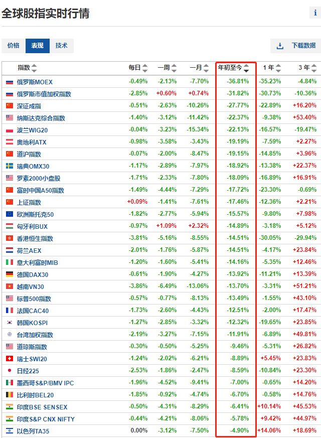 今年年初至今,全球40大主要股指中,仅有六个股指处于上涨,其中英国富时100指数和巴西BOVESPA指数涨幅几乎可以忽略不计,其余34大股指均处于下跌状态。跌幅最大的当属深陷俄乌冲突的俄罗斯股市,跌幅达30%以上,熊冠全球。紧随其后的是深证成份指数下跌27.77%和纳斯达克综合指数 下跌22.37%。