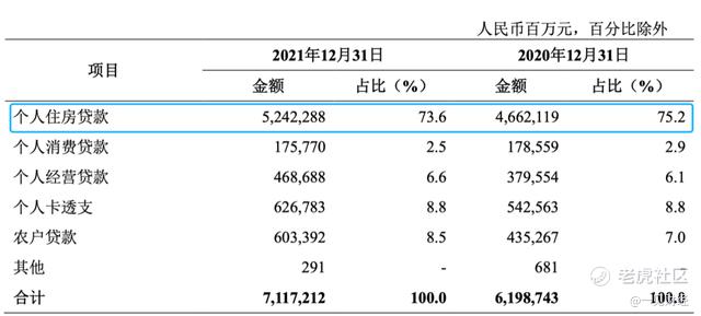 同时,农行2021年的个人住房贷款比例从2020年的75.2%下降到73.6%。