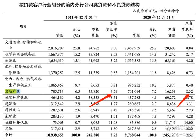 另外,工行房地产业不良贷款率也增长了一倍以上,2021年达到惊人的4.79%,在所有行业中位居第三,而2020年只有2.32%。
