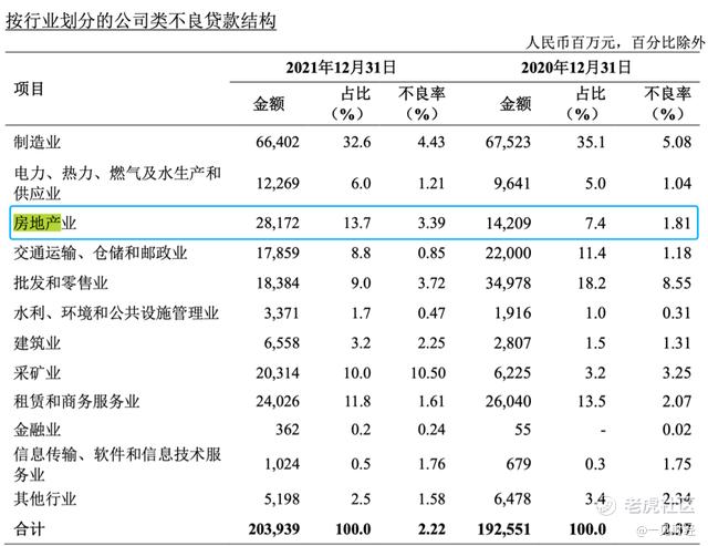 2021年财报显示,农行去年的地产业不良贷款余额为281.72亿元,和2020年的142.09亿元相比,几乎翻了一番。不良贷款率也从2020年的1.81%上升到2021年的3.39%,接近批发和零售行业的不良贷款率。