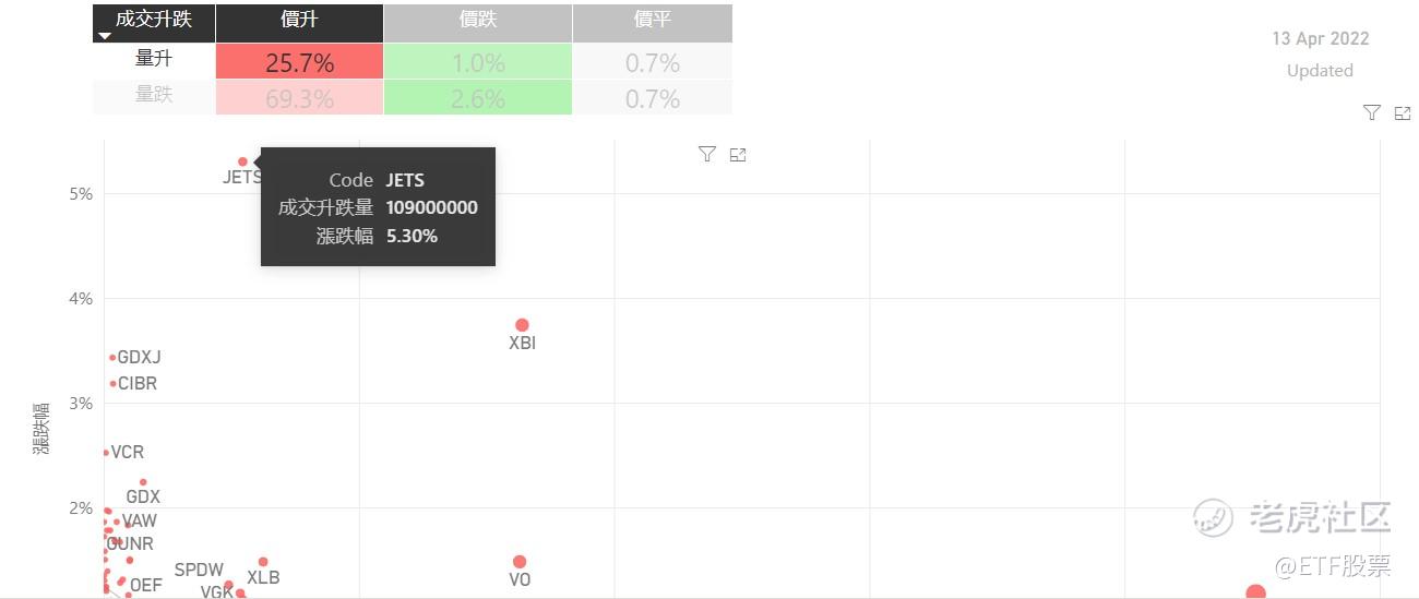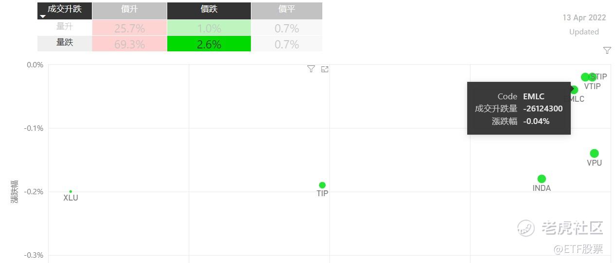 在4月13日的美股主要300只ETF交易品种中,有95%的ETF交易品种的ETF价格上升;尽管多于半数的ETF价格录得上升,不过仍有69%的ETF产品,虽然价格上升,成交额却下跌。