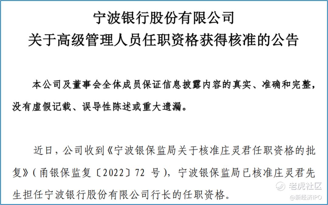 4月13日,宁波银行$宁波银行(002142)$ 发布公告称,公司收到《宁波银保监局关于核准庄灵君任职资格的批复》(甬银保监复〔2022〕72号),宁波银保监局已核准庄灵君担任宁波银行股份有限公司行长的任职资格。