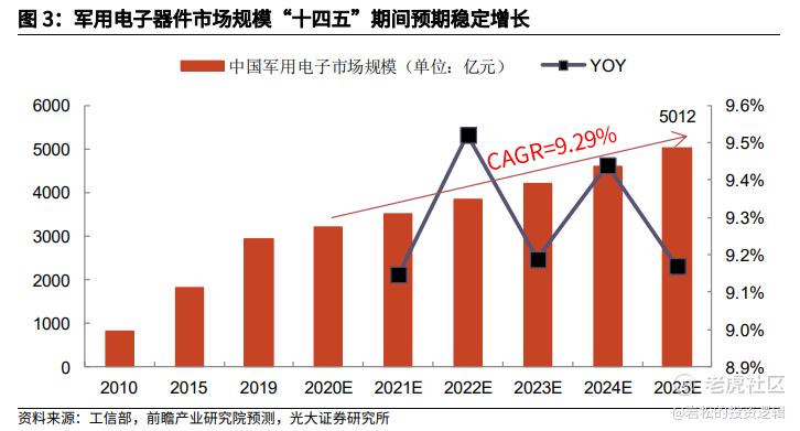 数据显示,从2010年到2019年,我国军用电子市场规模由819亿上升至2927亿,复合增速达到15.2%。前瞻产业研究院预计,“十四五”期间市场将继续保持稳健增长,到2025年或可突破5000亿元。