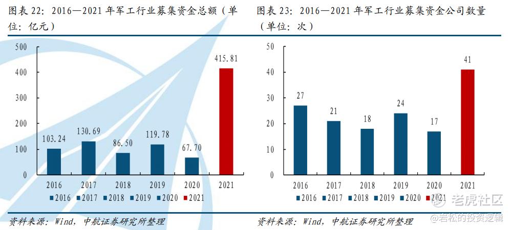 2021年,军工行业募资公司数量由2016年的27家增长至41家,募资总额达到415.8亿,超过了过去四年募资金额之和。