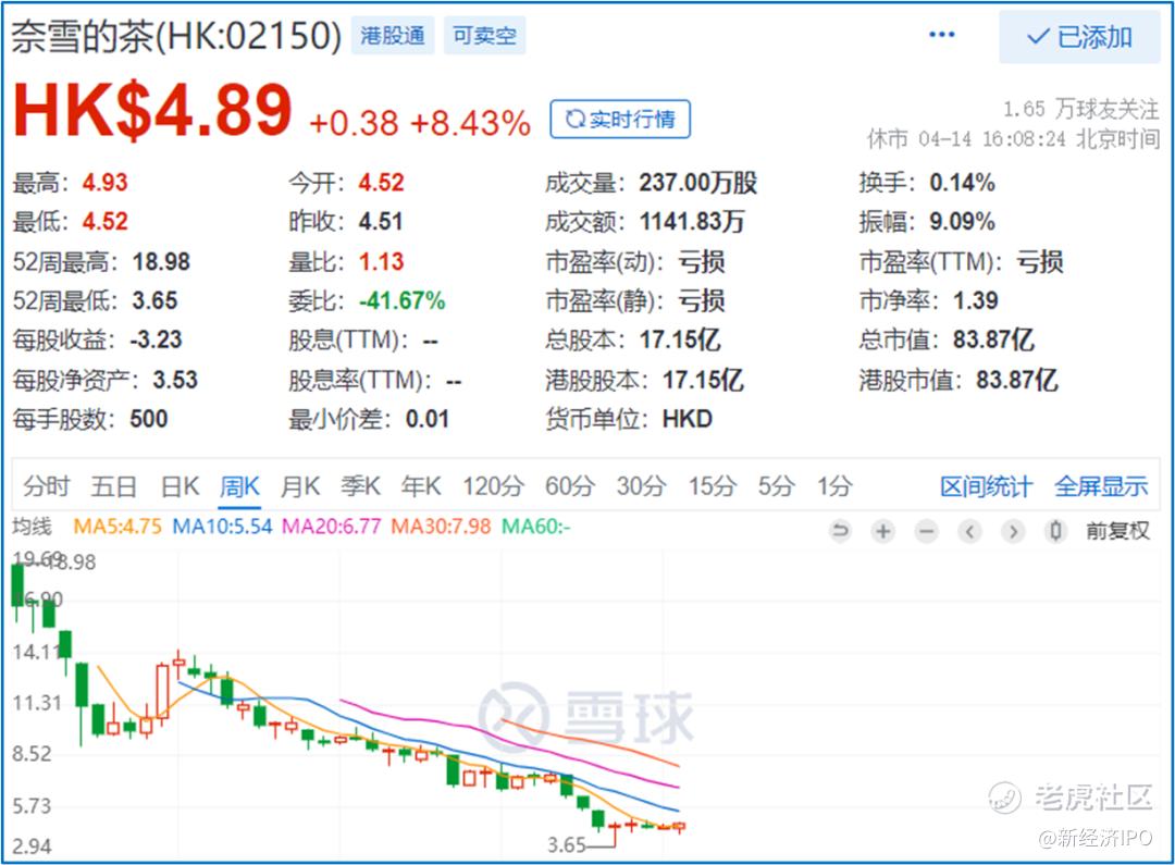 更糟糕的是,奈雪的茶上市不仅抢走了喜茶的风头和关注度,还拉低了茶饮赛道的估值。自去年7月份至今,奈雪的茶股价跌跌不休,从上市的接近20港元一路下跌至最低3.65港元,跌幅高达80%。如今奈雪的茶市值仅剩84亿港元。