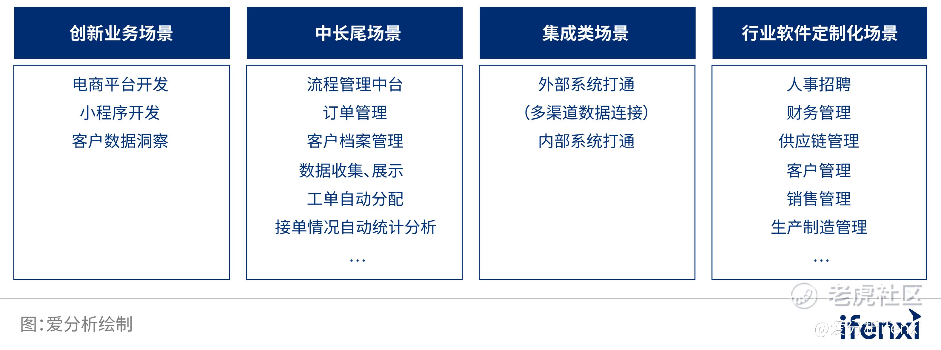 同时,企业数字化进程的推进,对于传统行业应用不能覆盖的中长尾场景数字化也逐步提上日程,从流程标准化管理到订单管理、工单自动分配等一些原来由线下纸质表单完成的流程也逐渐线上化,提升整体的协同效率。消费品与零售企业可根据自身系统建设情况对集成类场景与行业软件定制化场景进行考量。