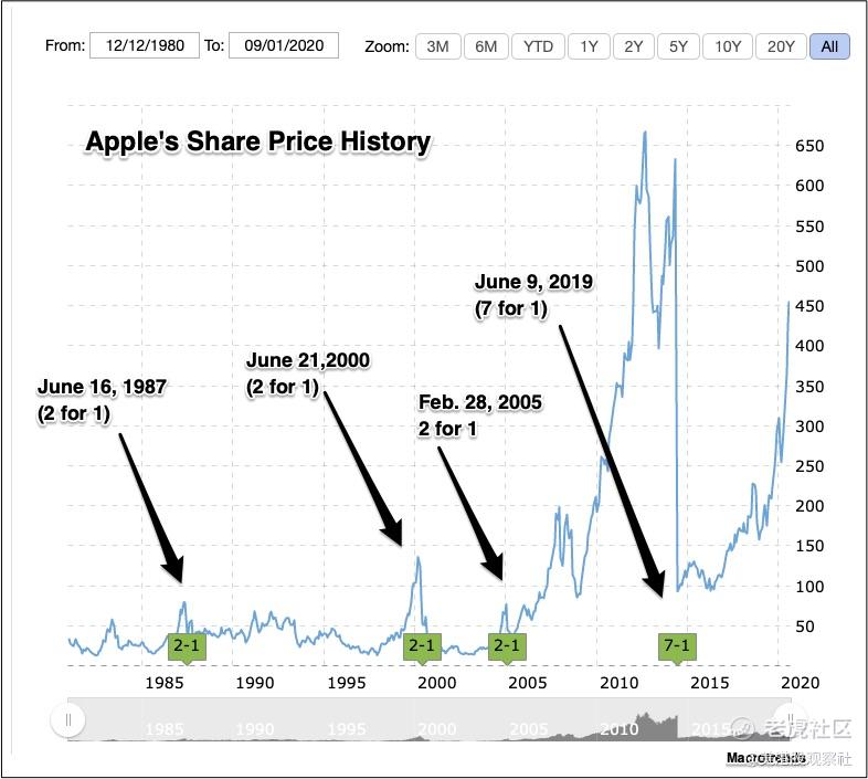 除了特斯拉,苹果也是拆股“小能手”,历史上苹果总共进行了5次拆股,三次1拆2,一次1拆7,最近的一次是2020年的1拆4。现在苹果的股价是170多美元,如果不拆股的话,苹果的股价要高达3.8万美元,这个价格很多散户可是买不起的。