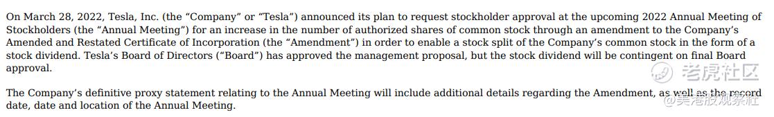 3月28日,特斯拉宣布,将在年度股东大会上对股票拆分计划进行投票。这是2020年8月第一次拆股之后,特斯拉再次计划对股票进行拆分。