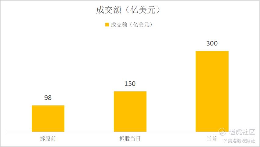买卖的股东变多了,成交量也就上去了。还是拿特斯拉为例,拆股前,每日成交额98亿美元,拆股后直接变成了150亿美元,现在更是达到了300亿美元。