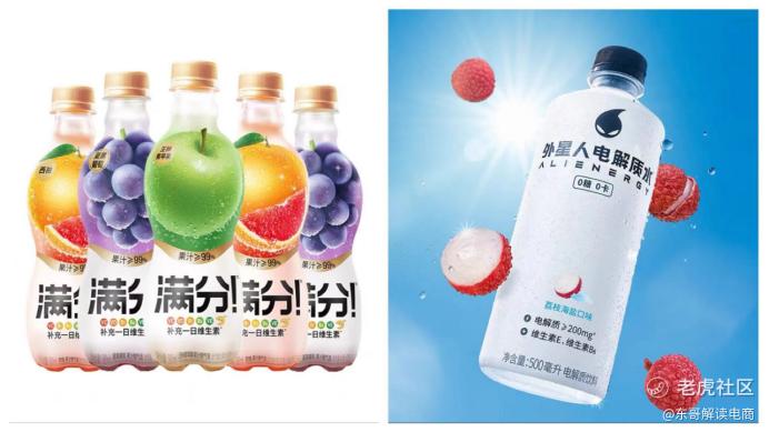 元气森林系列产品:满分果汁微气泡(左)外星人电解质水(右)