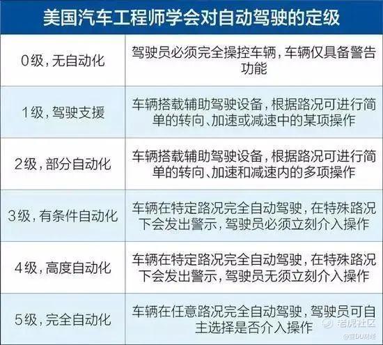 美国汽车工程师学会(SAE)的定义,无人驾驶可以分为六个等级,即:非自动化、L1辅助驾驶、L2半自动化,L3 的有条件自动化,L4 高度自动化,直到 L5 的完全自动化。