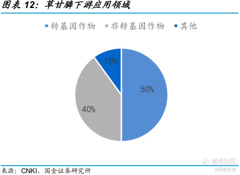 分析草甘膦的需求结构,其中转基因作物占比50%,非转基因作物占比40%。目前抗草甘膦的转基因种子主要由玉米、大豆、棉花几种作物组成,转基因大豆推广程度最高,占转基因作物总消费量的75%左右。