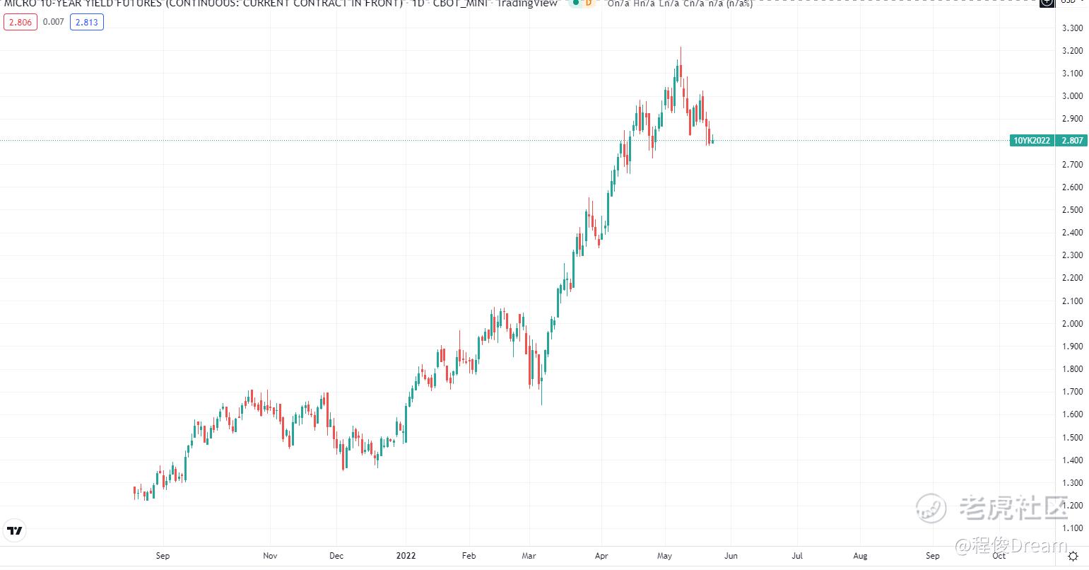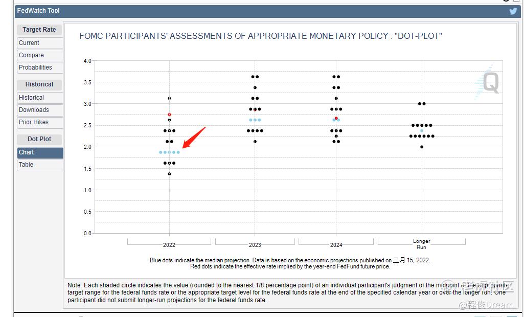 另外,在基本面上,我们从fedwatch数据看到,6和7月美联储预计还将有2次50个基点的加息力度,但是在那之后,整个年内的点阵图预期中值就将触及。换而言之,加息的强力风暴,就在未来2个月,并且已经得到“计提。”