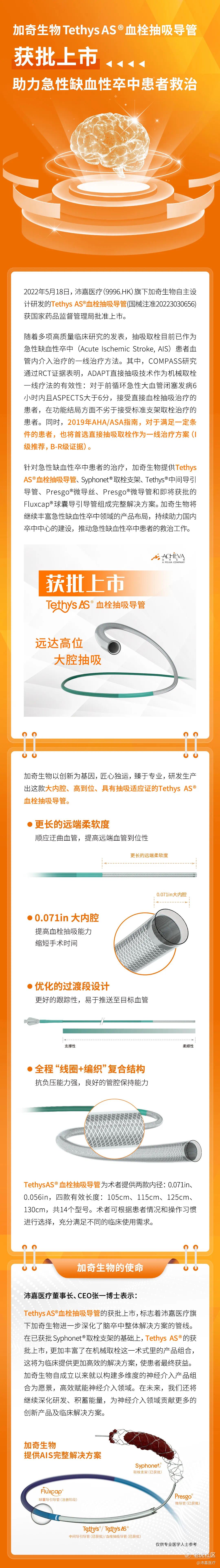 沛嘉医疗旗下加奇生物Tethys AS®血栓抽吸导管获批上市,助力急性缺血性卒中患者救治