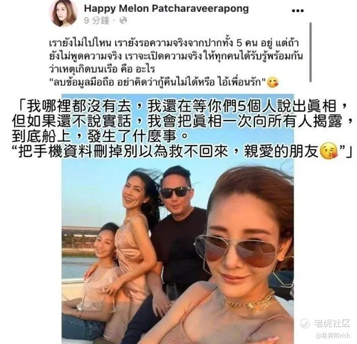 三个月前,泰国女星Tangmo和经纪人以及照片中的4人,1名变性名媛Sand与3名富商,一同乘坐游艇在湄南河游玩,之后Tangmo溺亡。
