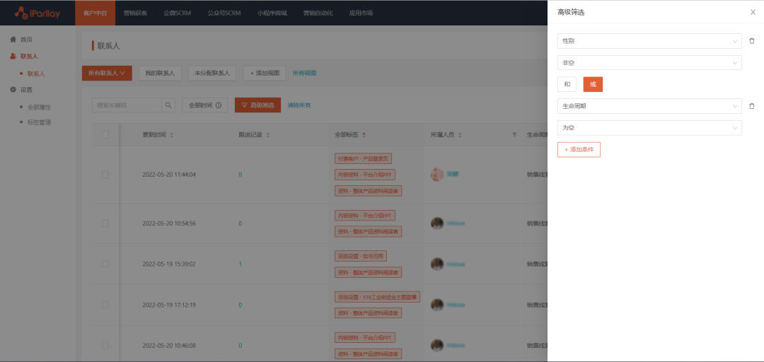 爱信来客户中台的联系人高级筛选功能板块,可自定义筛选出【具有同等条件】的某一群组的用户,并统一为其建立相同的标签。