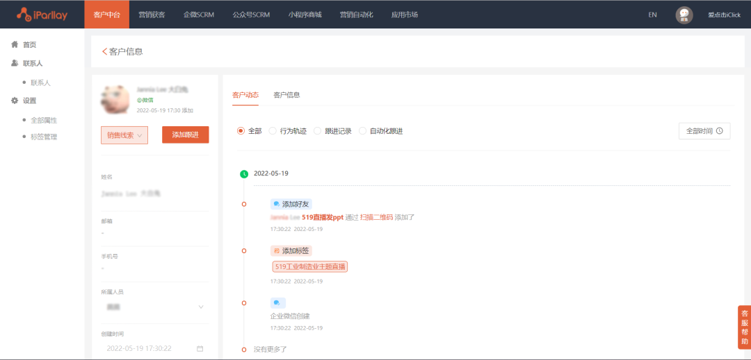 此外,在直播形式中,用户通过【直播间扫描特定二维码】,添加小助手企微后,即可被打上对应标签,并且他的行为轨迹、跟进记录也都会在爱信来客户中台中同步更新。