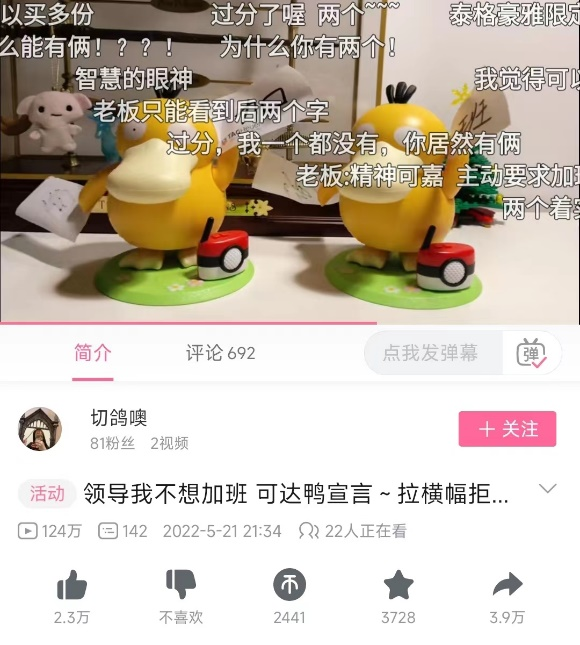 B站UP主“切鸽噢”也在套餐上新当日抢到两只可达鸭。她在家用便签纸写下“拒绝”“上班”两张字条,分别贴在可达鸭的两个手臂上,打开按钮。这段不到30秒的视频,在B站上浏览量超过120万。