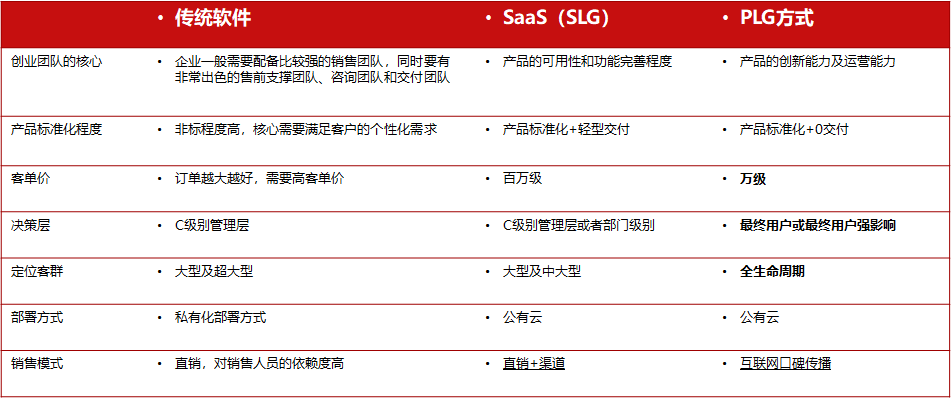从更细的颗粒度去对比的话,可以看到典型PLG模式下的产品更专注于产品的创新、线上的运营能力,以及产品的标准化程度;客单价其实相比于传统的管理型SaaS更低;决策层从原来的C级别的管理层到了终端用户手里;客群因为产品特点会从中小型覆盖到整个的生命周期,它的部署方式也是以公有云为主部署的。