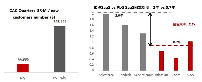 首先,对于一个典型的SaaS公司来说,我们一般会用LTV(Life time Value,即客户终身价值)和CAC(Customer Acquisition Cost,即客户获取成本)去做对比。我们也观察到一个现象,PLG公司并不比SLG公司在LTV指标上更有优势,原因是因为PLG公司是类2C的模式,所以它会表现出一个比较高的流失率。但极低的获客成本,使得该类型的公司,在一定的流失率下依然保持了很短的回本周期。这里也提醒我们,经典的SaaS指标,并不能完全套用PLG模式下的公司未来发展。