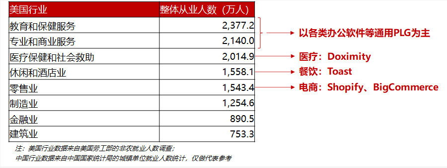 对于垂直类PLG产品,我们认为大的产业、从业人数多的行业及商业环境好的产业更容易生长出规模较大的公司。垂直类PLG产品的打法本质上也会跟通用类有一定的差异,他们必须会首先切一个产业链中的关键痛点和一个环节,再以这个节点为基础去做一个延伸。