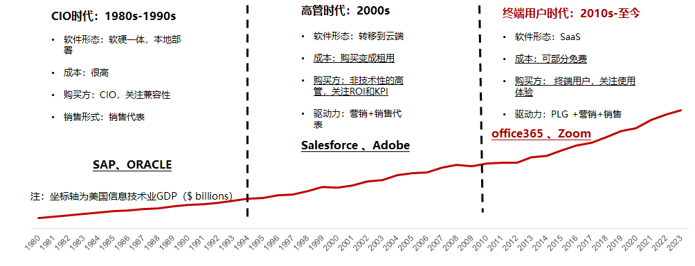 纵观美国市场,自2011年前后,伴随软件构建成本的下降和人工成本的上升,企业服务市场的的交易方式、交易渠道和采购决策发生了一系列变化,市场开始进入了“终端用户时代”。