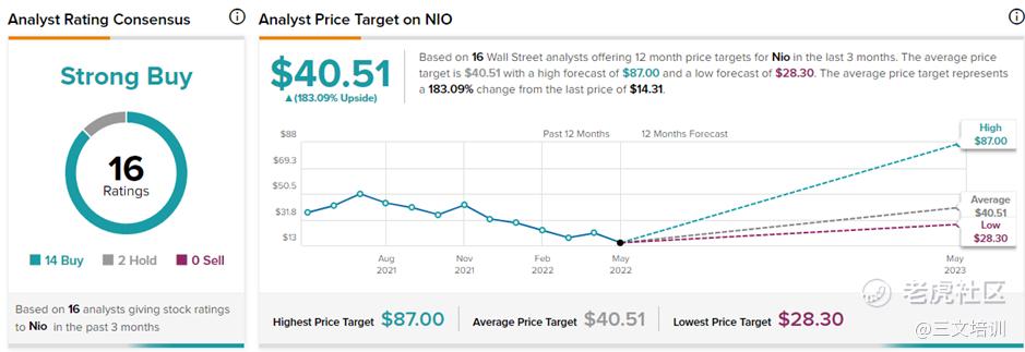 Investopedia将蔚来汽车列为三大最有价值的电动车股项,与此同时华尔街16位分析师,其中14位给予买进评级,2位守住,最高目标价位87美元,最低目标价是28.3美元。