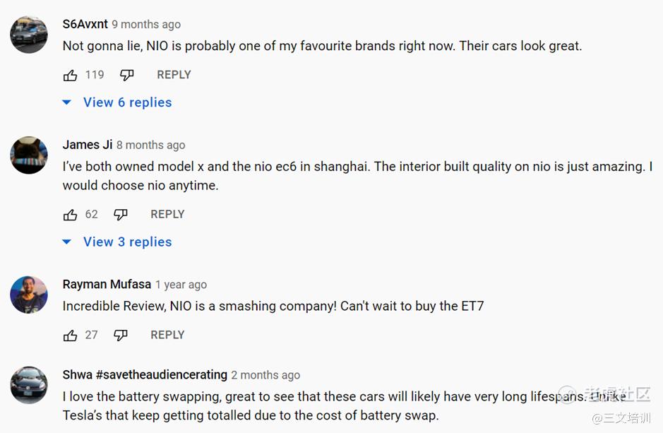 浏览数个视频就多条评语,不少人对蔚来汽车都有相当好的评价,希望蔚来汽车日后可在本人所在地开展业务。