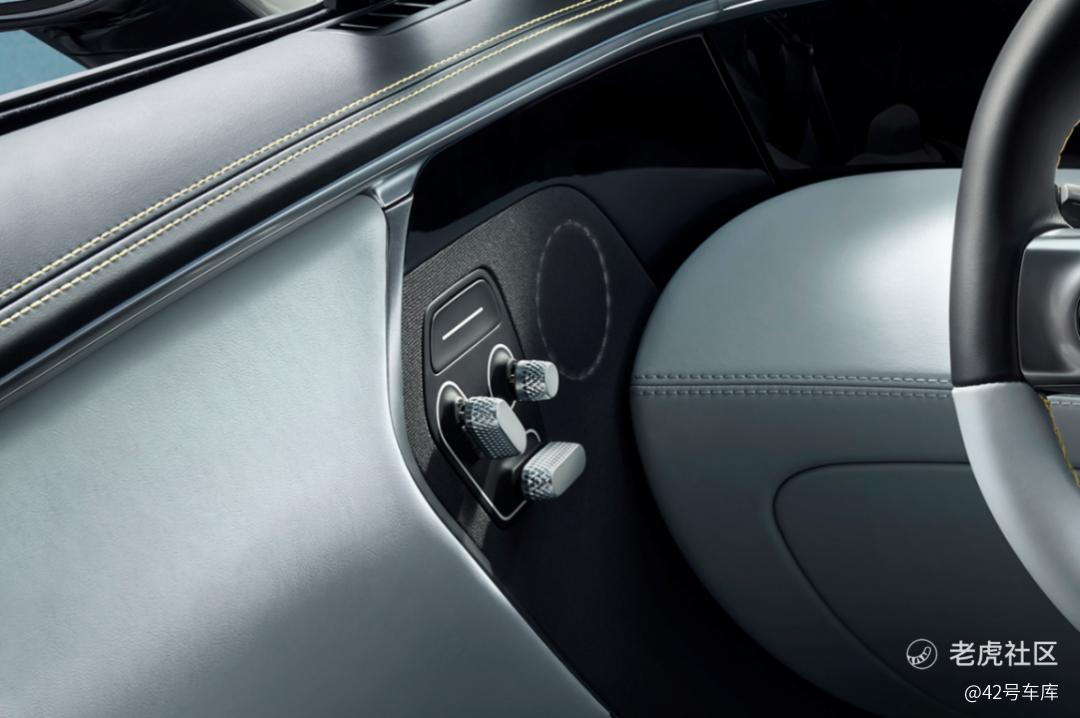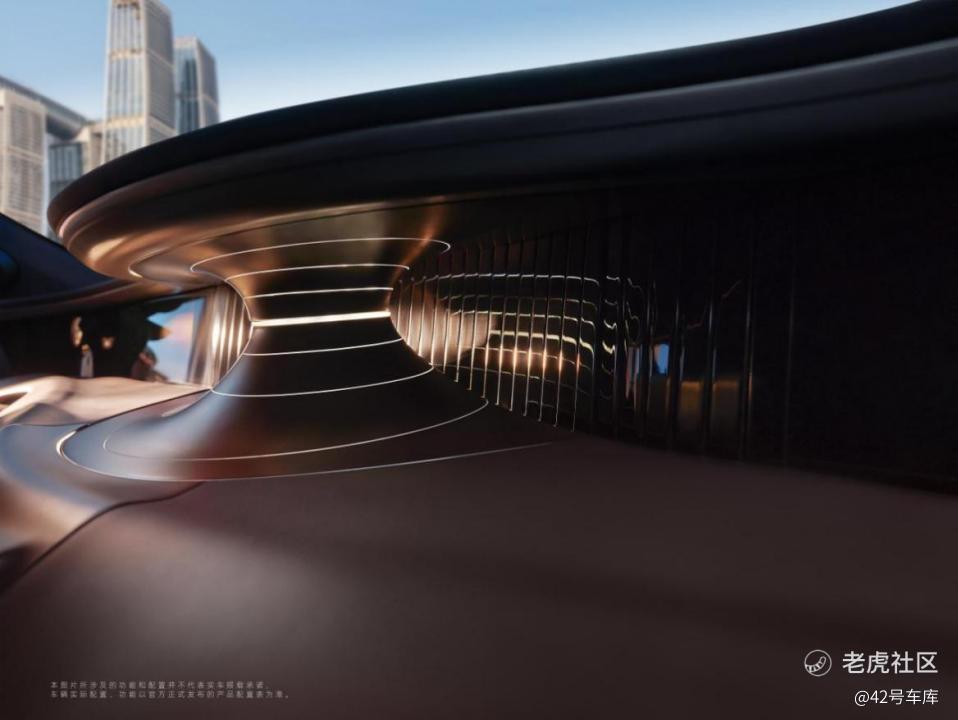 座椅调节按钮放置于门板,同样采用金属滚花工艺。车门上的扬声器单元带有环状灯带,隐隐约约透过植绒面显现出来。银色金属质感的氛围灯条被黑白两色的软触漆面板夹在中间。