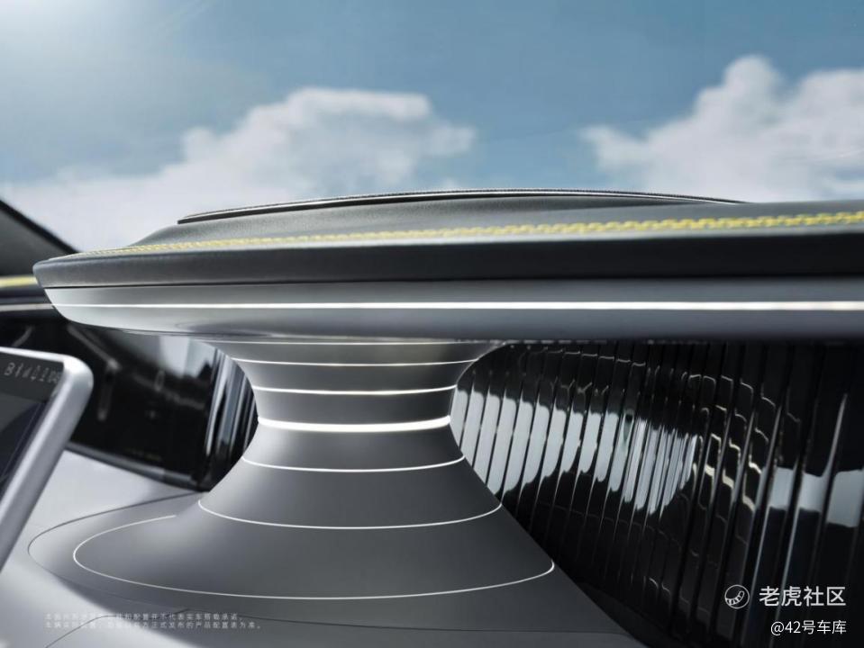 回到前排,我们不难发现,阿维塔 11 的仪表台分为上下两个部分,而仪表台上半部分的凸出,阿维塔科技的设计师也对它进行了巧妙的设计,用一个锥形将其与下半部分相连。这就是阿维塔 11 一直强调的「Vortex 情感涡流」。