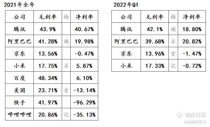 于是,梅姨找了几家互联网公司的毛利率和净利率数据,由于有些公司还没公布2022年Q1的数据,所以梅姨把2021年全年的数据也一并统计了,供大家参考。