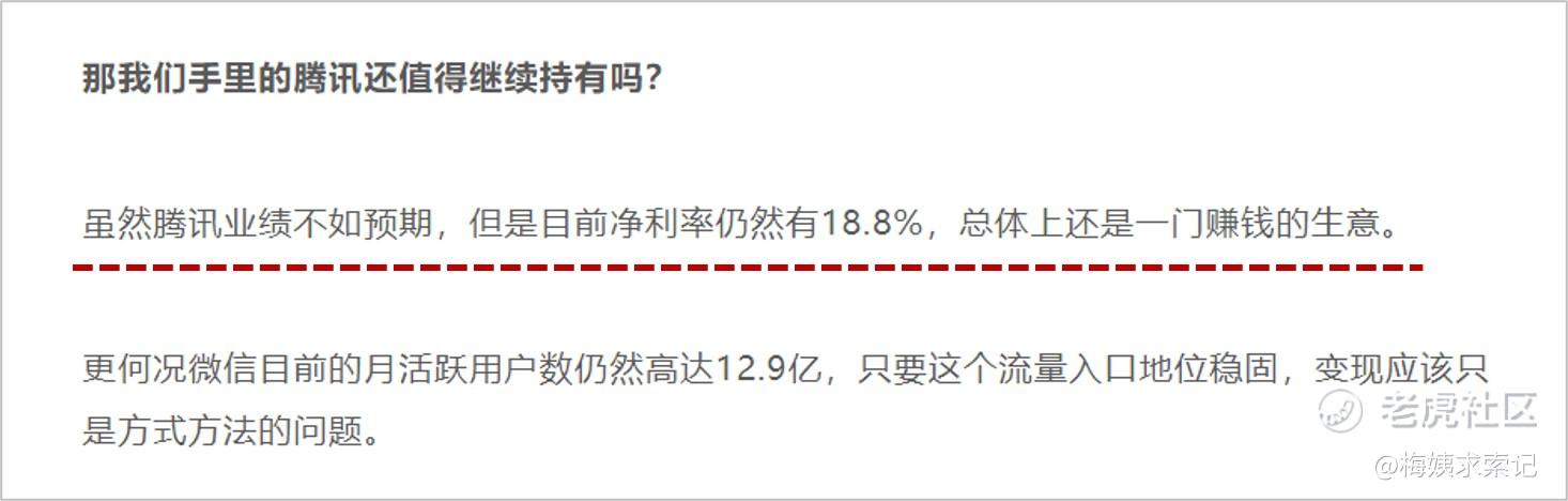上周,梅姨在《平均月薪8万的腾讯,还值得持有吗?》中写了这样一句话:“虽然腾讯业绩不如预期,但是目前净利率仍然有18.8%,总体上还是一门赚钱的生意。”